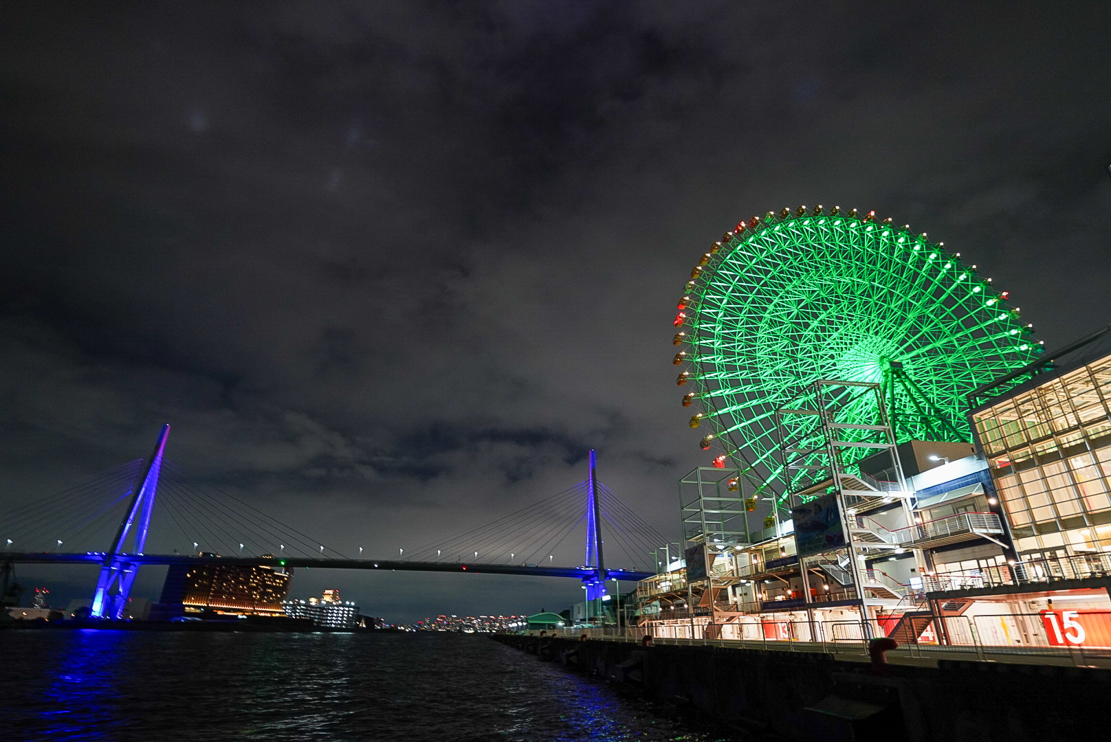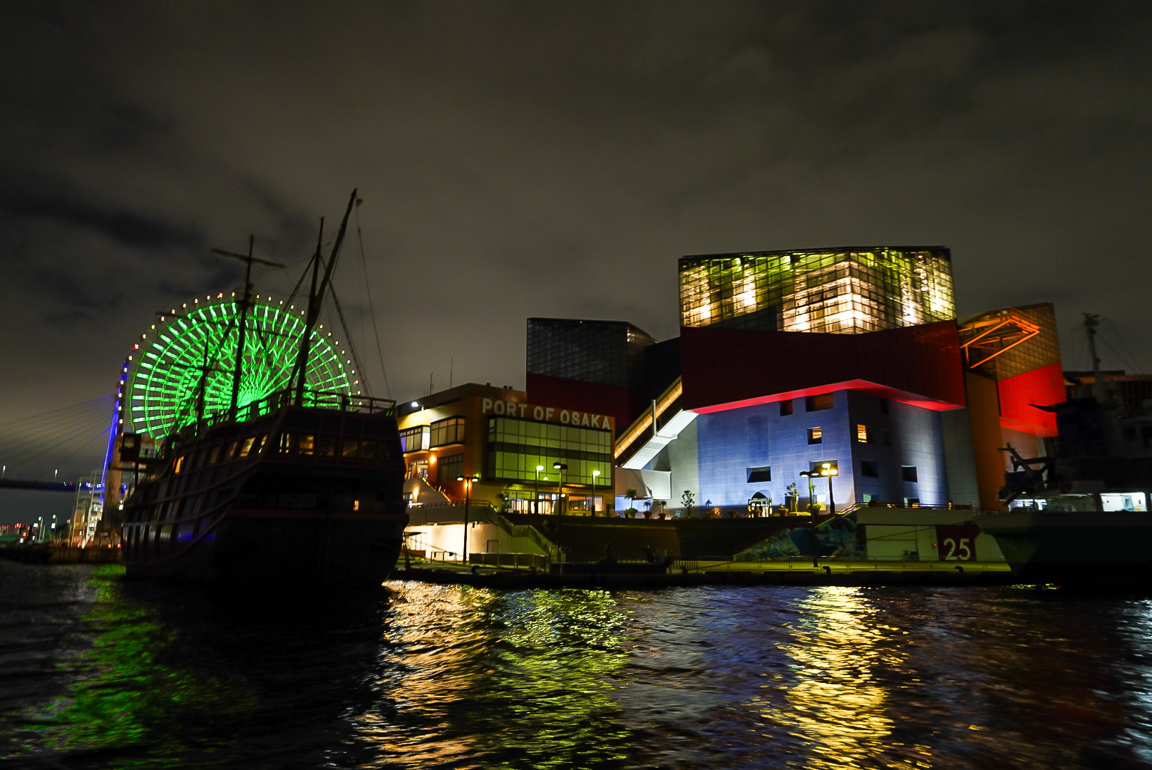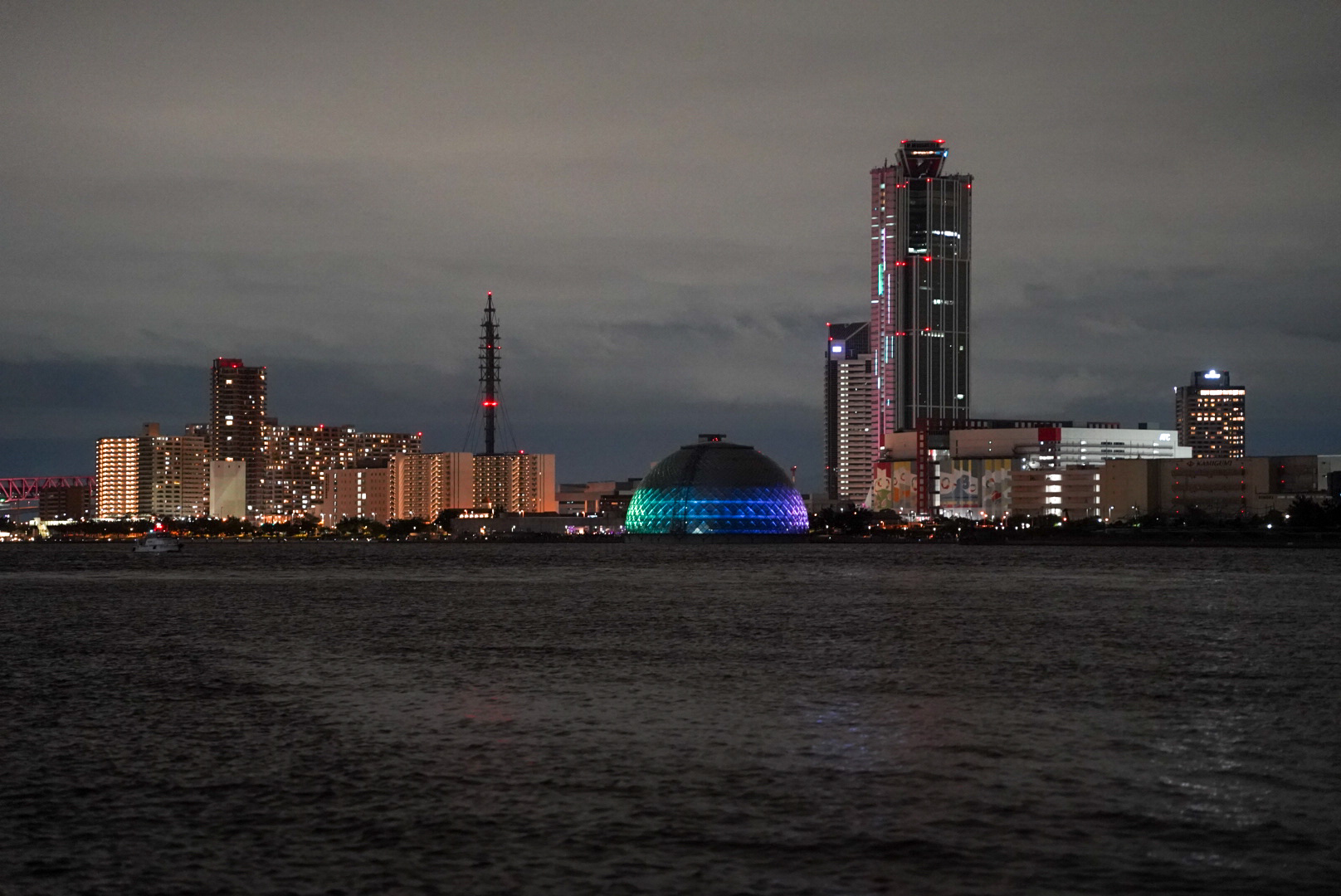船上から見渡す大阪湾には、コスモスクエアドーム、OAPタワー、天保山観覧車、そしてサンタマリア号の光が浮かび上がり、花火とともに幻想的な景色を描いていました🌉