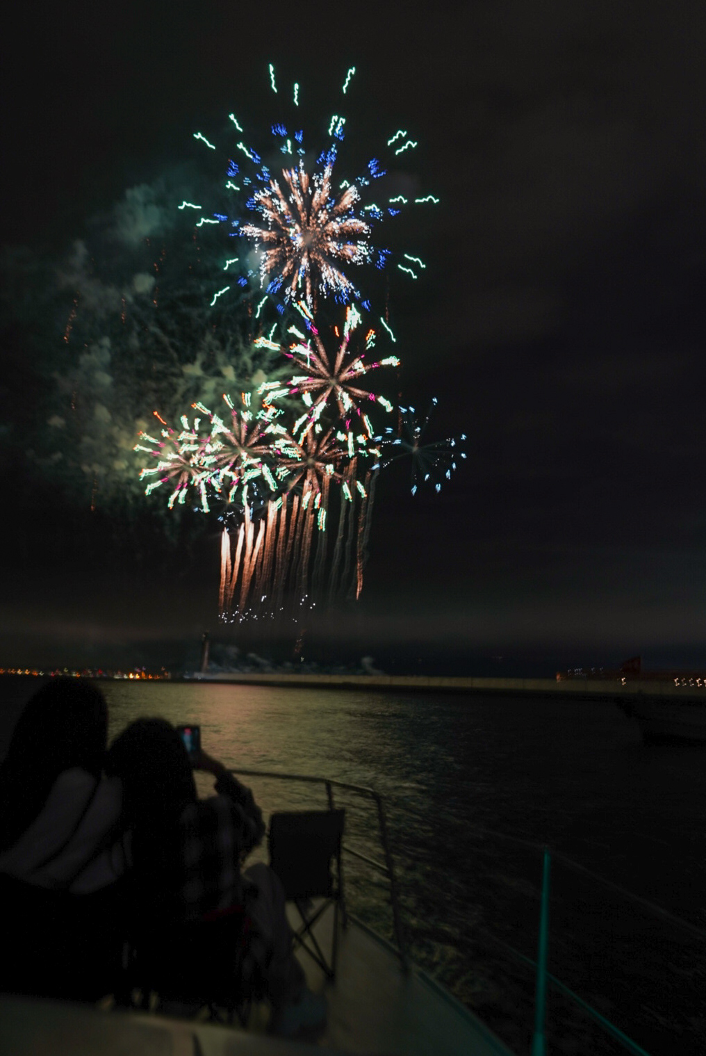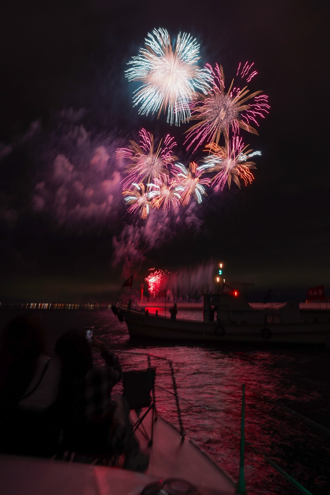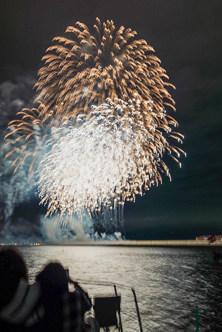 横動画ではカメラを何度も上に向けないと映しきれないほどのスケール感。爆音が海面に反射して全身に響き、光が水面を照らすたびに船体がわずかに揺れる。その一瞬一瞬が、まさに“生きた芸術”のようでした🌊✨